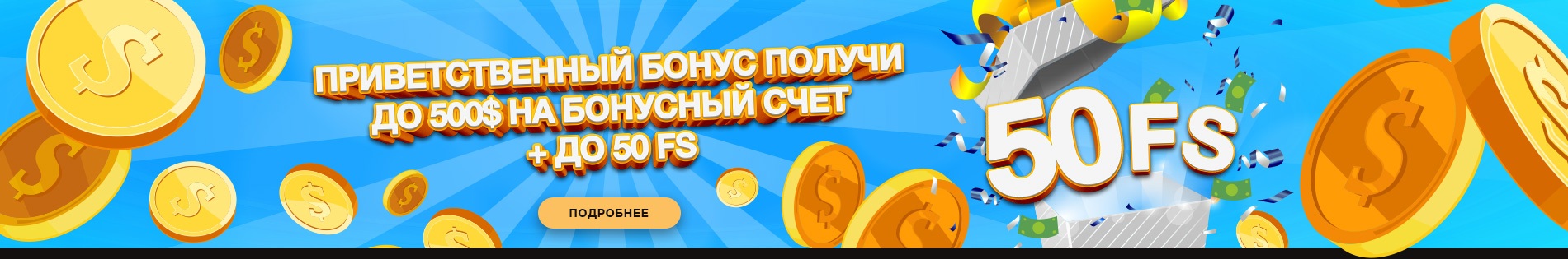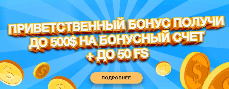 | Приветственный бонус | Выдается за первое пополнение баланса на сайте. Равен 100% от внесенной на счет суммы, но не меньше 10 и не больше 500 долларов. Отыгрыш данного подарка осуществляется по вейджеру 45. |